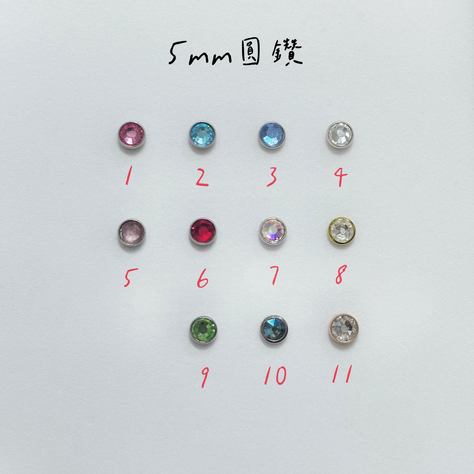 顏色:1粉色、2水藍、3湛藍色、4銀框白鑽、5藕色、6猩紅色、7淺紫色、8金框白鑽、9草綠色、10紫彩色、11玫瑰金框白鑽